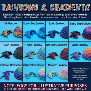 Crafted with passion using top-of-the-line 3D printers, our dragons boast unparalleled quality. With a vast palette, we showcase popular and unique colors! Dive into Magic, TriMagic, Rainbow, and Gradient hues, each bearing unique finishes that make these dragons stand out.